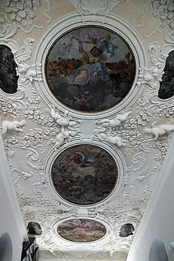 Das ehemalige Jesuitenkolleg ist ein zweigeschossiger, zwölfachsiger, streng symmetrisch gegliederter[5] Renaissancebau des 17. Jahrhunderts. Der Putzbau ist mit turmartigen Eckaufsätzen mit laternenbekrönten Schweifhauben von Johann Georg Judas aus den Jahren 1694 bis 1701 geschmückt. Das Gebäude wird dem Kurtrierischen Hofbaumeister Johann Christoph Sebastiani zugeschrieben. Der Portalschmuck stammt von Lorenz Staudacher. Das der Jesuitenkirche zugewandte Portal führt zu einer dreischiffigen Durchfahrt mit Kreuzgewölben auf Säulen.[6] Die ehemalige Aula des Gymnasiums war ursprünglich erheblich größer und reich mit Stuckornamenten verziert, vermutlich ähnlich der noch heute erhaltenen Treppenhausdecke. Sie besaß zwei Bühnen für die von Schülern des Gymnasiums aufgeführte Theaterstücke. Nach der Aufteilung im 19. Jahrhundert beherbergt die ehemalige Aula heute den Anfang des 20. Jahrhunderts entstandenen historischen Rathaussaal der Stadt Koblenz. Erhalten ist dagegen die reich verzierte Stuckdecke des Carlo Maria Pozzi mit Fresken des Meisters Lucaes (eventuell Luca Antonio Colomba) im Treppenaufgang zur Aula. Die drei großen Deckenmalereien entsprechen dem pädagogischen und religiösen Programm des Jesuitenordens: Sie zeigen die „Bestrafung der Faulen“, den „Triumph des wahren Glaubens“ und den „Lohn des Fleißes“. Die vier kleineren Felder zeigen Landschaften mit denen vielleicht die vier Jahreszeiten gemeint sind. Vor dem Eingang in den Rathaussaal befinden sich heute die Tafeln mit den Koblenzer Ehrenbürgern. Die erhaltenen älteren Stuckdecken im West- und Südflügel sind schlichter gestaltet. Sie zeigen aus Leisten gebildete geometrische Formen, die nur noch teilweise erhaltene Decke der heutigen Eingangshalle ist eine sog. Kölner Decke. In der Eingangshalle befindet sich außerdem die aus der Koblenzer Dominikanerkirche stammende Grabplatte des Heinrich von Rübenach. Auf der Rückseite des Aulaflügels liegt ein würfelförmiger Granitquader, bei dem es sich sehr wahrscheinlich um einen römischen Kelterstein handelt.