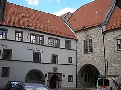 Das Rathaus in Mühlhausen/Thüringen liegt zwischen dem Unter- und Obermarkt, teilweise über dem Bachlauf der Schwemmnotte. Im Hof befinden sich noch Reste des mittelalterlichen Marstalls. Der älteste, gotische Teil des Rathauses ist am Spitzbogen über der Ratsstraße zu erkennen.
