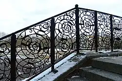 Zum Hauptportal auf der Mittelachse führt eine doppelläufige Freitreppe in Dreiecksform. Das Geländer war ursprünglich vergoldet. Das Eingangsportal von 1686 wird von drei allegorischen Figuren geschmückt, die Weisheit, Gerechtigkeit und Mäßigung symbolisieren.[1] Das Portal wurde in Stockholm vermutlich von dem schwedischen Bildhauer Nicolaes Millich (tätig zwischen 1669 und 1685) oder seinem Schüler P. Schulz gefertigt.