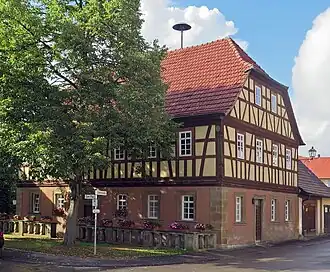 Der zweigeschossige traufständige Halbwalmdachbau mit Fachwerkobergeschoss hat ein Erdgeschoss aus Sandsteinquadermauerwerk. Die Sonnenuhr über dem Portal an der Traufseite ist mit der Jahreszahl 1792 bezeichnet. Die Balustrade aus Sandstein vor der gleichen Seite wurde um 1782 geschaffen. Das Obergeschoss hat geschnitzte Eckständer.