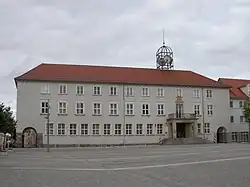 Nach der Zerstörung des Rathauses wurde die Verwaltung bis zum Neubau provisorisch in der Käthe-Kollwitz-Schule untergebracht.