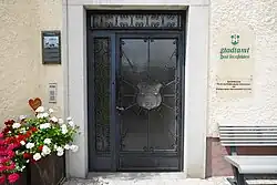 Die Hauptfront zum Hauptplatz zeigt eine Giebelfassade flankiert von 3/4-Rundtürmen mit Zwiebeldächern. Ein barockes und stark erneuertes Fassadenbild zeigt Justitia, seitlich davon ist ein Teil des ehemaligen Sgraffitodekors mit Blattwerk um 1608 erhalten.