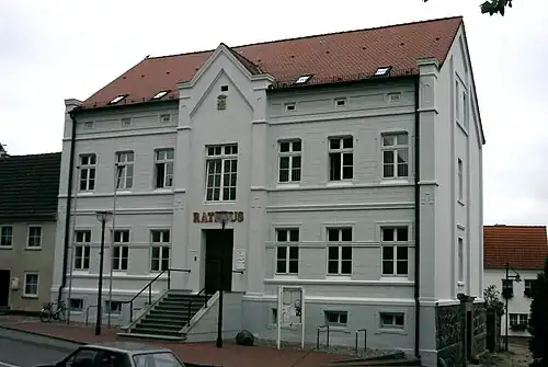 Die Einrichtung des Rathauses war ursprünglich bis 1945 so ausgerichtet, dass im Obergeschoss die Wohnung des Bürgermeisters mit allen entsprechenden Räumen war. Im Untergeschoss waren die Verwaltungsräume. Im Dachgeschoss befanden sich Lager- und Archivräume und im Kellergeschoss waren 3 Gefängniszellen, die kleine Wohnung des Polizeiwärters sowie weitere Archivräume.