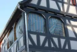 Das Gebäude war fachwerksichtig, der Bauschmuck ist jedoch eher zurückhaltend, so auch die Farbfassungen. Es wurde geflößtes Nadelholz verwendet, was relativ selten der Fall war.[13]