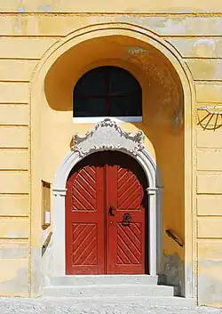 Das hohe, rumpfartige Gebäude besitzt an seiner Ostseite einen leicht eingezogenen, polygonal geschlossenen Chor mit flachen und abgetreppten Strebepfeilern. An der Nordseite finden sich zwei rundbogige Kellertore sowie eine Tür zum Turmaufgang. Die Südseite verfügt über das rundbogige Kapellenportal aus dem 16. Jahrhundert mit einer barocken Kartusche und die Außentreppe zum Obergeschoß. Das dortige rechteckige Portal stammt ebenfalls aus dem 16. Jahrhundert und trägt im Türsturz als Relief zwei wappentragende Löwen.