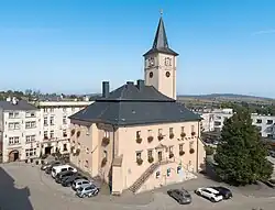 Der heutige Bau geht auf einen Neubau nach einem Stadtbrand im Jahre 1545 zurück. Aus jener Zeit stammt der Nordteil mit seinem Gewölbe. 1609–1628 wurde an der Südseite der Rathausturm errichtet, der die vorher am Kirchturm befestigte Stadtuhr trug. Die Fassade wurde mit Sgraffito versehen. 1750 fanden weitere Umbauten statt, 1852 wurden eine Aussichtsterrasse sowie das spätklassizistische Portal an der Südfassade ergänzt. 1882–1885 wurde das Rathaus erneut umgestaltet.