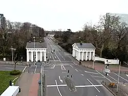 Das Ratinger Tor bildet den Abschluss der Ratinger Straße, einer der ältesten Straßen Düsseldorfs, die den Beginn eines mittelalterlichen Weges vom Rhein in Richtung der Stadt Ratingen und weiter nach Velbert darstellt.