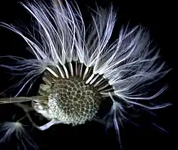 Die strohfarbenen bis rötlich-braunen Achänen sind 2 bis 3 Millimeter lang, deutlich abgeflacht und mehr oder weniger geflügelt, beiderseits mit je drei oder selten fünf Längsrippen versehen, auf der Fläche und zwischen den Rippen glatt[3] und nicht querrunzelig.[5] Der weiße Pappus ist 6 bis 9 Millimeter lang.[3]