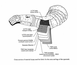 Jeder Raumanzug besteht aus zahlreichen Schichten verschiedener Textilien, Kunststoffen wie Nylon, Dacron und Mylar und häufig auch Metallen. In der innersten Schicht sind Schläuche eingelegt, durch die kaltes Wasser gepumpt wird, damit der Raumfahrer in seinem Anzug nicht überhitzt. Darüber befindet sich eine Schicht Neopren, die gasdicht, aber flexibel ausgeführt ist, und so den Überdruck halten kann. Zudem ist die Neoprenschicht von einer weiteren kräftigen Textilschicht umgeben. Die äußeren Anzugsschichten bestehen aus widerstandsfähigen feuerhemmenden Aramidfasern. Raumanzüge für Außenbordarbeiten sind zudem an der Außenseite mit Aluminium oder anderen Stoffen beschichtet, um Sonnenstrahlung zu reflektieren. Diese beiden Außenschichten schützen den Träger auch vor Mikrometeoriten und Strahlung.