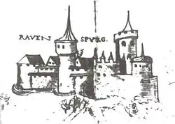 Danach erfolgte durch Bernhard I. ein umfangreicher Wiederaufbau und Umbau der Ravensburg zu einer neuzeitlichen Festung. Im Nordosten und Südwesten entstanden starke Geschütztürme, wovon einer heute noch erhalten ist und drei Wehrebenen hat. Sehr wahrscheinlich waren diese Türme überdacht. Noch heute führt von dem erhaltenen Wehrturm ein unterirdischer kasemattenähnlicher Gang nach Norden, bzw. später nach Nordosten. Der hierbei angefallene Aushub wurde zur Aufschüttung eines Walls in 15 Meter Abstand zur Außenmauer verwendet. Dieses Bauwerk gilt als der einzige erhaltene unterirdische Wehrgang des Kraichgaus. Einst verband der Gang alle wichtigen Verteidigungspunkte, wie Tore, Geschütztürme, Wehrmauern etc. und ermöglichte über einen Treppenturm auch das schnelle Erreichen der Aussichtsplattform auf dem Bergfried. Auch entstand in jener Zeit die Umfassungsmauer samt Verteidigungseinrichtungen, der deutlich vergrößerten Vorburg und sicher auch Wirtschafts- und evtl. Wohngebäuden. Der noch heute vorhandene, vermutlich einst 45 Meter tiefe, aber nicht mehr wasserführende Brunnen, dürfte ebenfalls spätestens zu dieser Zeit entstanden sein.