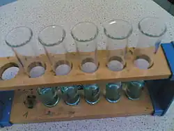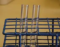 Oft werden Reagenzgläser auch in einen Reagenzglaskasten (auch bekannt als Reagenzglasständer oder Reagenzglasgestell) gestellt.[3]