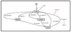 Dabei werden beim Zustandswechsel Codestücke ausgeführt, die der Programmierer/Modellierer an die States und Transitionen anhängt. Solche Codestücke werden in einer Detail Level Language, meist der Zielsprache der Codegenerierung, verfasst. Beim State unterscheidet man Entry und Exit Code. Bei einem Zustandswechsel wird zunächst der Exit Code des Ausgangszustands ausgeführt, dann der Action Code der feuernden Transition und schließlich der Entry Code des Zielzustands. Sehr häufig wird von solchen Code Stücken eine Nachricht über einen Port des Aktors gesendet.