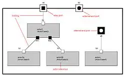 Die Ports eines Aktors können Teil seines Interfaces (also außen sichtbar) oder Teil seiner Struktur (also von ihm selbst verwendet) oder beides sein. Ports, die nur zum Interface gehören, werden Relay Ports genannt. Sie sind direkt mit dem Port eines Subaktors (einer Aktorreferenz) verknüpft. Ports, die nur zur Struktur gehören, werden interne End Ports genannt. Ports, die zu Struktur und Interface gehören, werden externe End Ports genannt.