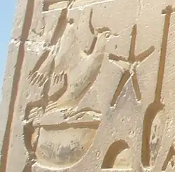 - ↑ Sonderzeichen U 103 gemäß Petra Vomberg: Sonderzeichenliste In: Rainer Hannig: Großes Handwörterbuch Ägyptisch-Deutsch : (2800 - 950 v. Chr.). von Zabern, Mainz 2006, ISBN 3-8053-1771-9, S. 1448.