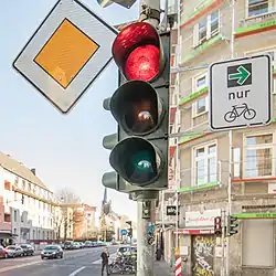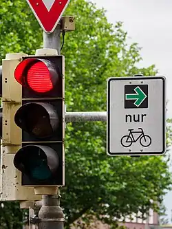 Das Bundesverkehrsministerium prüfte 2019, ob das Rechtsabbiegen an roten Ampeln durch ein neu einzuführendes Verkehrszeichen erlaubt werden soll.[23][24] Dazu fand ein einjähriger Pilotversuch an insgesamt 40 signalisierten Kreuzungen in den Städten Bamberg, Darmstadt, Düsseldorf, Köln, Leipzig, München, Münster, Reutlingen und Stuttgart statt.[25][26] Außerdem hat Berlin, das bei der Bewerbung um die Teilnahme an dem Pilotversuch unterlegen war, am 5. April 2019 offiziell erklärt, mit fünf Kreuzungen auf eigene Kosten an dem Versuch teilzunehmen.[27] Dafür wurde das bestehende Verkehrszeichen 720 „Grünpfeil“ mit dem Zusatz „nur Radverkehr“ kombiniert.[28]