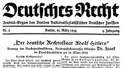 Hans Frank (damals bayerischer Justizminister, Reichskommissar für die Gleichschaltung der Justiz und Präsident der Akademie für Deutsches Recht; später „Generalgouverneur“ für das besetzte Polen) veröffentlichte 1934 in dem – 1931 gegründeten – NS-Organ Deutsches Recht einen Aufsatz mit dem Titel „Der deutsche Rechtsstaat Adolf Hitlers“[12] als Abdruck einer zuvor von ihm im Deutschlandsender gehaltenen Rundfunkansprache. Der Ausdruck „deutsche[r] Rechtsstaat“ kommt nur in der Überschrift vor und wird nicht genauer erklärt.