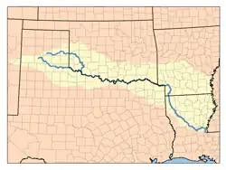 Red River (blau) und sein Einzugsgebiet (gelb). Die Karte enthält einen kleinen Fehler: In Arkansas und im Norden Louisianas erstreckt sich das Einzugsgebiet nicht ganz bis zum Mississippi.
