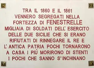 Zwischen 1860 und 1861 wurden in der Festung Fenestrelle Tausende von Soldaten der Armee der beiden Sizilien festgehalten, die sich geweigert hatten, ihren König und ihr ehemaliges Vaterland zu verleugnen. Wenige kehrten nach Hause zurück. Die meisten starben an Hunger. Die wenigen, die dies wissen, verneigen sich.