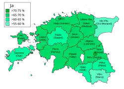 Die folgende Tabelle zeigt die Ergebnisse des Referendums in den einzelnen Regionen Estlands.[6] Die Wahlbeteiligung lag landesweit bei 64,06 %.