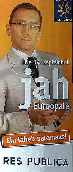 In einer Referendum am 14. September 2003 hatten die Wähler Estlands über den Beitritt des Landes zur Europäischen Union zu entscheiden. Mehr als zwei Drittel der Abstimmenden stimmten für den Beitritt, der dann am 1. Mai 2004 erfolgte.