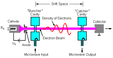 Im Klystron erfährt ein im Vakuum erzeugter und durch Hochspannung beschleunigter Elektronenstrom durch ein hochfrequentes elektrisches Wechselfeld eine Geschwindigkeitsmodulation. Er durchläuft dazu einen mit einem Hochfrequenz-Signal gespeisten Hohlraumresonator. Nach einer gewissen Laufzeit bewirkt die Geschwindigkeitsmodulation eine Dichtemodulation. Der modulierte Elektronenstrom kann durch einen oder mehrere weitere Hohlraumresonatoren (Mehrkammerklystron) geführt werden, und am letzten Resonator kann ein Teil seiner Energie als Hochfrequenzenergie entnommen werden.