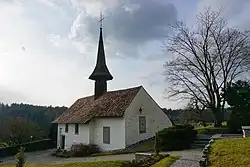 Auf einem Hügelsporn gut sichtbar über den wenigen Häusern des Ortes steht das Kirchlein mit der hölzernen Vorhalle gegen das Tal ausgerichtet. Ein mit Holzschindeln verkleideter Dachreiter für zwei Glocken steht in der Mitte des Dachfirstes. Im Inneren zeigt sich ein Kirchenraum mit eingezogenem Chor, der an der Nordseite eine Ausbuchtung aufweist, die auf eine kleinere Kapelle als Vorgängerbau schliessen lässt. Durch die Anordnung der Mauern und Fenster kann von mehreren Bauphasen ausgegangen werden. An der Nordwestseite wurde 1703 ein Aufenthaltsraum für den Pfarrer und die Taufleute angebaut. Eine kleine Empore ist neben der Pforte an der Südseite zugänglich. Das unterhalb der Kirche stehende Gebäude wurde früher als Pfarrhäuschen bezeichnet, heute befindet sich darin ein Gemeinderaum.