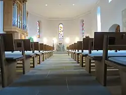 Die Saalkirche mit leicht erhöhtem Polygonalchor wurde 1616–1618 nach Plänen von A. Ziegler errichtet. Seitlich schließt der Turm mit Spitzhelm an. An der Außenseite der Kirche befinden sich wertvolle Epitaphien von Pfarrern aus dem 18. und 19. Jahrhundert. Die Empore ist über ein Vorzeichen mit steilen Pultdach erreichbar. Die polygonale Kanzel von 1617 ist ein wertvolles Zeugnis frühbarocker Intarsienkunst. Neueren Datums sind der Taufstein von Charlotte Germann-Jahn aus dem Jahr 1972, die Kuhn-Orgel von 1973. Die Farbglasfenster der Brüder von Taizé stellen Gleichnisse aus dem Matthäus-Evangelium dar.