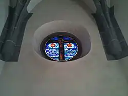 Das Rundfenster in der mittleren Chorwand enthält die Darstellung "Der gekreuzigte Heiland" von Ernst Rinderspacher (1943)[7]. Spätgotischer Taufstein mit zwölfeckiger Schale und einem Schaftring in der Art des Granatapfelnodus[8]. Polygonale, undekorierte Kanzel um 1740.[9]