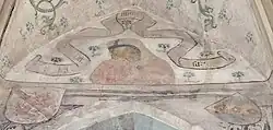 - ↑ Die Wandmalereien an der Südmauer zeigen heute die ehemalige Höhe an.