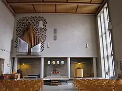 Prägendes Element des Innenraums ist der Orgelprospekt an der Nordostwand, der aus drei unvollständigen Pfeifenreihen besteht. Er ist umgeben von kreisförmigen Öffnungen in der Wand, die zur optischen wie zur akustischen Ästhetik der Orgel beitragen: Das eigentliche Orgelwerk befindet sich hinter der Wand. Diese Bauweise führte zu gegenteiligen Meinungen verschiedener Experten, die von „unbrauchbar“ bis „sehr gute Lösung“ reichten. Als die Orgel 1952 in der geschlossenen, schlecht belüfteten Orgelkammer aufgebaut wurde, noch bevor die neu gebaute Kirche trocknen konnte, führte dies zu Schäden an Holz, Filz und Leder sowie zu Korrosion an Kontakten. Das von der Firma Orgelbau Goll erbaute Instrument verfügt über zwei Manuale und Pedal mit 20 Registern, 2 Auszügen und 1 Transmission und 2 Extensionen. 1966 schlug der Orgelbauer eine Generalrevision vor, 1991 erfolgte eine Revision durch die Erbauerfirma Goll und 2022 durch Orgelbau Späth (Rüti).[4]