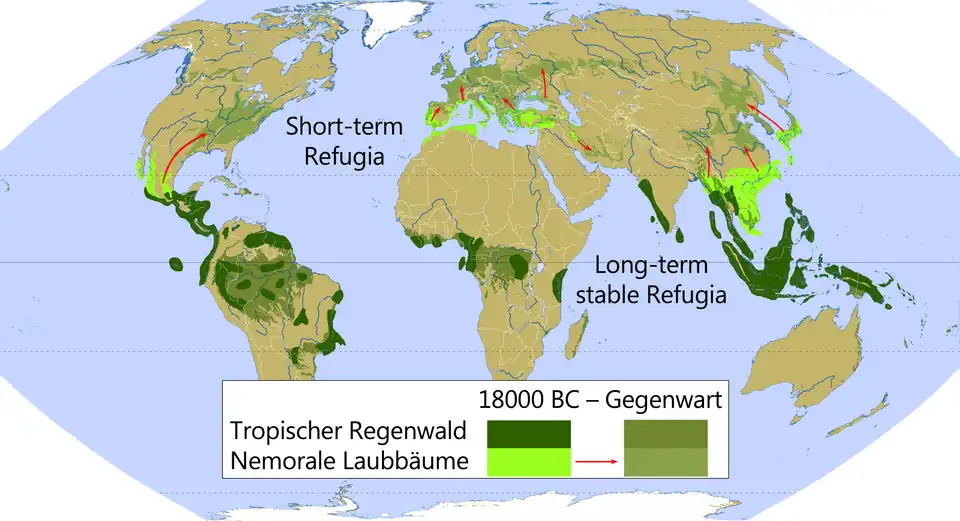 Durch globale Klimaänderungen (etwa während der Eiszeiten) entstanden immer wieder Refugialräume für zahlreiche Arten. Dabei wird (vor allem in der englischsprachigen Literatur) zwischen zwei verschiedenen Typen unterschieden:[5]