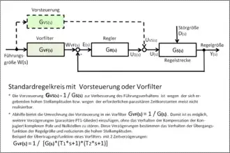 Abhilfe bietet die Umrechnung der Vorsteuerung in einen Vorfilter mit der Wirkung gleicher dynamischer Eigenschaften auf den Regelkreis. Anstelle der Vorsteuerung wird ein Vorfilter vor dem Regelkreis eingesetzt, welches durch die Führungsgröße gespeist wird. Das Vorfilter erhält die Invertierung der Übertragungsfunktion des geschlossenen Regelkreises (ohne Vorsteuerung).