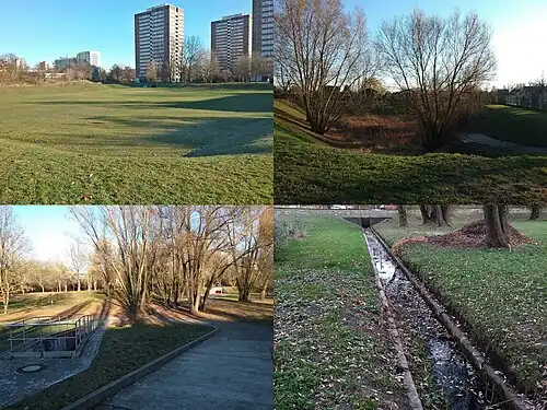 Im Nordwesten von Marzahn zwischen der Märkischen Allee und dem Bürgerpark Marzahn (⊙) befindet sich das Regenrückhaltebecken, das meistens trocken liegt. Dort stehen Eichen, Linden, Ahorn, und Pappeln und das Becken ist mit einer Trittgrasflur bewachsen. Es besitzt am Westzipfel einen gemauertern Zulauf. Rund um das Regenrückhaltebecken geht ein Spazierweg entlang und an der Ostseite führt eine kleine Treppe ins Becken.