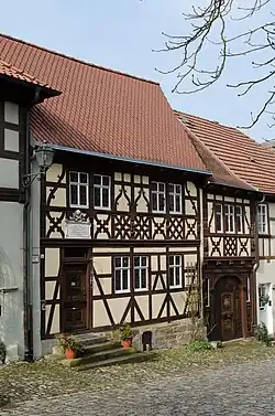 Das zweigeschossige und traufständige Satteldachhaus mit seitlichem Torhaus wurde 1881 im Stil der Neurenaissance verändert. Das Haus besitzt ein aufwendiges Fachwerk, Butzenscheibenfenster und ein reich verziertes Holztor.