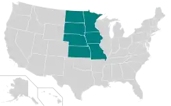 | Jahr | Iowa | Kansas | Minnesota | Missouri | Nebraska | Norddakota | Süddakota |