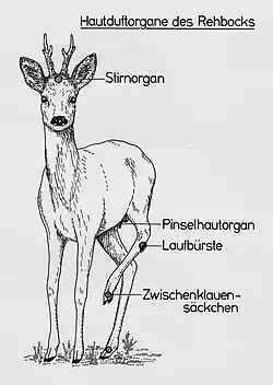 Das Reh ist sehr am Geruch orientiert. Es zählt zu den sogenannten Makrosmatikern, da ein hoher Anteil der Nasenschleimhaut mit einem Riechepithel (Riechschleimhaut) überzogen ist. Auf dem etwa 90 Quadratzentimeter umfassenden Riechepithel befinden sich rund 320 Millionen Riechzellen.[32] Rehe sind in der Lage, bereits geringe Duftreize wahrzunehmen, und riechen einen Menschen aus einer Entfernung von 300 bis 400 Metern.[33]