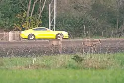Rehe kommen auch in der modernen Agrarlandschaft vor, in denen Wälder und Feldgehölze selten sind oder sogar ganz fehlen. Nach der Definition des Arbeitskreises Wildbiologie und Jagdwirtschaft werden Rehe als Feldrehe bezeichnet, wenn sie eine positive Verhaltensanpassung an diesen Lebensraum aufweisen: Sie haben Teile ihres Territorialverhaltens aufgegeben und flüchten bei Störungen nicht in den schützenden Busch oder Wald, sondern auf Distanz ins offene Feld. Dort halten sie sich überwiegend auf, statt täglich vom Wald ins Feld und zurück zu wechseln. Sie leben einen großen Teil des Jahres in Rudeln[80] und zeigen vor allem im Winterhalbjahr ein Verhalten, das an die typischen Herdentiere der Steppenzone erinnert.[81] Häufig umfassen solche Rudel 30 bis 40, in strengen und schneereichen Wintern sogar bis zu 100 Tiere.[82] Die Tendenz, bei fehlender Deckung größere Gruppen zu bilden, kommt auch bei anderen Hirscharten vor, die sowohl Waldlandschaften als auch offene Gebiete bewohnen. Vergleichbare Beispiele sind Axishirsch, Sambar, Schweinshirsch und Weißwedelhirsch.
