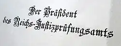 Mit Verordnung über den Ausbau des Reichsjustizprüfungsamtes vom 27. Februar 1935 (RGBl. I S. 342)[2] durch den Reichsminister der Justiz, Franz Gürtner, wurde die bis dahin zentrale Durchführung der großen Staatsprüfung den örtlichen Stellen überlassen. Nach Paragraph 1 der Verordnung leitete das RJPrA das gesamte juristische Prüfungswesen. Zudem stellte es die Aufgaben, beaufsichtigte die Prüfungsämter und Prüfungsstellen und trug dafür Sorge, dass im gesamten Reich nach gleichen Grundsätzen verfahren und nach gleichem Maßstab geurteilt werden sollte.[3] Dazu wurden Prüfungsstellen in Berlin, Dresden, Düsseldorf, Hamburg, München und Stuttgart eingerichtet.