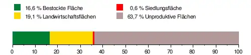 Es besteht zu 16,6 % aus bestockter Fläche, zu 19,1 % aus Landwirtschaftsfläche, zu 0,6 % aus Siedlungsfläche und zu 63,7 % aus unproduktiven Flächen.