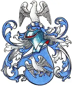 Blasonierung: In Blau ein silberner auffliegender Vogel. Auf dem blau-silbern bewulsteten Helm mit blau-silbernen Helmdecken der Vogel wachsend, der rechte Flügel silbern, der linke blau.[1]
