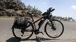 - Leistungsfähige Bremsen: Bei Ausfall einer Bremse muss das Rad auch bei Regen und Gefällestrecken alleine mit der verbleibenden Bremse zum Halten gebracht werden können. In der Regel wurden, bevor Alternativen zur Verfügung standen, Cantilever-Bremsen, bevorzugt aber V-Bremsen (V-Brakes) sowie hydraulische Felgenbremsen eingesetzt. Inzwischen sind an neueren Reiserädern Scheibenbremsen üblich (je nach Reiseland können Ersatzteilversorgung und Reparaturmöglichkeiten unterwegs jedoch eingeschränkt sein). Aufgrund der stärkeren Belastung müssen Rahmen und Gabel vom Hersteller zur Verwendung mit hydraulischen bzw. Scheibenbremsen freigegeben sein.[5] Gewöhnliche Rücktritt- und Trommelbremsen können bei längeren Abfahrten überhitzen und sollten auf Gefällestrecken nur als zusätzliche, dritte Bremse eingesetzt werden, sofern der Hersteller die Verwendung als Hauptbremse am Reiserad (bzw. am Fahrrad oder am Lastenrad) nicht ausdrücklich freigibt.[6][7]