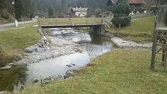 ![]() Zusammenfluss von Großweißach (links) und Reitbach (rechts) in Glashütte. Ab diesem Punkt wird das Gewässer Weißach genannt. | ||
