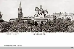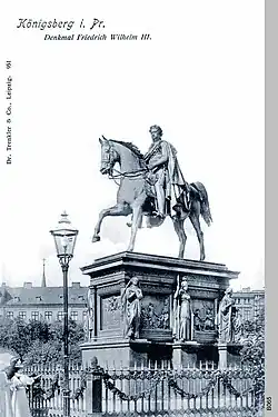 Im Rahmen der Planungen eines Zentrums für Kunst und Wissenschaft in Königsberg durch König Friedrich Wilhelm IV. und Friedrich August Stüler sollte am Neubau der Universität (1857–1862) an den verstorbenen König Friedrich Wilhelm III. erinnert werden. Die Stände der Provinz Preußen taten dies im Jahre 1851 bereits vor dem Baubeginn, indem sie im Namen der dankbaren Preußen, wie es auf der Inschrift hieß, ein bronzenes Reiterstandbild errichteten. Modelliert von August Kiß und gegossen aus erbeuteten französischen Geschützen, zeigte die fünf Meter hohe Figur den lorbeerbekränzten König im Purpurmantel als Triumphator im Befreiungskrieg. Er zügelte mit Kraft sein ungeduldig scharrendes Pferd. Die Figur erhob sich auf einem sechs Meter hohen Sockel, geschmückt mit sechs Frauenfiguren die Glauben, Tapferkeit, Gerechtigkeit, Liebe, Friede und Weisheit darstellten.