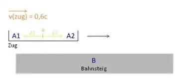 Ausgangspunkt für die spezielle Relativitätstheorie ist die durch zahlreiche Beobachtungen bestätigte Tatsache, dass die Messung der Lichtgeschwindigkeit in jedem Inertialsystem und unter allen Umständen stets denselben Wert liefert. Man spricht von der „Invarianz der Lichtgeschwindigkeit“. Unter dieser Voraussetzung machen wir folgendes Gedankenexperiment: Ein Zug fährt mit hoher Geschwindigkeit durch einen Bahnhof. Nun wird im Zug mittig zwischen zwei mitgeführten Uhren A1 und A2 ein Lichtblitz ausgelöst, wobei bei Ankunft der Lichtblitze an den Uhren die jeweilige Uhr zu laufen beginnt. Da die Lichtgeschwindigkeit in jedem Inertialsystem in allen Richtungen gleich groß ist (siehe oben), wird ein Fahrgast des Zuges, also ein Beobachter im Ruhesystem des Zuges, durch späteren Uhrenvergleich feststellen, dass A1 und A2 von den Lichtblitzen gleichzeitig erreicht wurden und die beiden Uhren somit synchron zu laufen begannen. Vom Standpunkt eines Beobachters im Ruhesystem des Bahnhofes sieht die Reihenfolge der Ereignisse aber anders aus. Um den Zeitpunkt der Ankunft der Lichtblitze bei A1 und A2 genau bestimmen zu können, hat er mit Lichtsignalen synchronisierte und mit Sensoren ausgestattete Uhren am Bahnsteig befestigt. Für diesen Beobachter bewegt sich der Zug mit hoher Geschwindigkeit (in der Abbildung Durchfahrt von links nach rechts). Daraus folgt, dass der Blitz zu A2 einen längeren Weg zurücklegen muss als zu A1, weil A2 sich von der Stelle, von der der Blitz ausgegangen ist, fortbewegt, wohingegen A1 sich auf diese Stelle zubewegt. Die an den Gleisen befestigten Uhren werden folglich anzeigen, dass A1 zeitlich vor A2 vom Blitz getroffen wurde und früher zu laufen begann. A1 und A2 sind aus Sicht des Ruhesystems des Bahnhofes also nicht synchron.