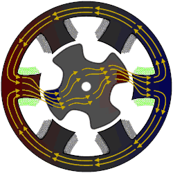- (kurz SRM, von englisch: switched reluctance motor, auch SR-drive):[6] Geschaltete Reluktanzmotoren haben eine unterschiedliche Anzahl ausgeprägter Zähne bzw. Pole an Rotor und Stator. Die Statorzähne sind mit Spulen bewickelt, die abwechselnd ein- und ausgeschaltet werden. Die Zähne mit den bestromten Wicklungen ziehen jeweils die nächstgelegenen Zähne des Rotors wie ein Elektromagnet an und werden abgeschaltet, wenn (oder kurz bevor) die Zähne des Rotors den sie anziehenden Statorzähnen gegenüberstehen. In dieser Position wird die nächste Phase auf anderen Statorzähnen eingeschaltet, die andere Rotorzähne anzieht. Im Allgemeinen hat ein geschalteter Reluktanzmotor drei oder mehr Phasen. Es gibt aber auch Sonderbauformen mit nur zwei oder einer Phase. Um im richtigen Zeitpunkt umzuschalten, wird die Maschine in der Regel mit einem Rotorlagegeber versehen. In geberlosen Steuerverfahren wird der Zeitpunkt zum Umschalten anhand des Statorstroms oder des Drehmomentes detektiert. Reluktanzmotoren dieser Bauart zeichnen sich durch hohe Robustheit und einen geringen Bauaufwand aus. Wie Asynchronmaschinen bilden sie im unbestromten Zustand bei Drehung im Prinzip kein Drehmoment aus. Eine Restmagnetisierung führt jedoch oft zu einem kleinen Rastmoment im stromlosen Zustand. Bei niedrigen Drehzahlen sind sie den Asynchronmaschinen bezüglich Drehmomentdichte aufgrund der hohen herstellbaren Polpaarzahlen überlegen, bei höheren deutlich unterlegen. Permanenterregten Synchronmaschinen sind sie diesbezüglich auf jeden Fall unterlegen.