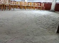 Eine Besonderheit ist der Sand auf dem Boden der Kirche. Dieser soll zum einen eine schalldämmende Wirkung haben, durch zufällige Spuren wie ein dekorativer Bodenbelag aussehen und den Dielenboden sauber und trocken halten.