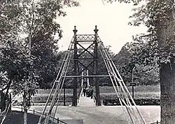 Mitte des 19. Jahrhunderts war für die Pleiße ein Flutbett von der Gegend des Connewitzer Wehrs (damaliger Abzweig der Rödel) bis zur Weißen Elster am jetzigen Palmengartenwehr angelegt worden. Über dieses Flutbett wurde 1881 am Ort des heutigen Rennbahnstegs eine schmale Fußgängerbrücke in Form einer Hängebrücke errichtet. Sie sollte nach dem Leipziger Stifter Ferdinand Rhode (1802–1872) Rhode-Brücke heißen. Der Name setzte sich nicht durch. Bei den Leipzigern war es die Kettenbrücke, offiziell später der Kettensteg.[3]
