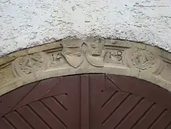 Das Rentamt an der Stettener Straße 2 steht mit dem Giebel zur Straße, und an dieser Seite befindet sich ein rundbogiges Tor zum Kellergeschoss, dessen Schlussstein das Allianzwappen des Dietrich von Gemmingen (1584–1659) und seiner ersten Frau Agnes von Reischach († 1614) sowie die Jahreszahl 1618 trägt. Wie es zu diesem Wappen kommt, ist unklar, zumal Dieter den Urkunden nach Besitz am Unterschloss hatte und 1618 bereits mit Anastasia von Degenfeld verheiratet war.[2] Gleichwohl gilt 1618 als Baujahr des Gebäudes. Der Keller des Hauses weist ein Tonnengewölbe aus Sandsteinquadern auf. Der kleine, etwas höher liegende Kellerraum links des Eingangs wirkt älter, sein spätgotisches Fenster wurde jedoch erst später eingesetzt.[3]