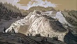 Viele Arbeiter kamen aus der Umgebung, die meisten jedoch waren Wanderarbeiter aus Vorarlberg, der Schweiz, Württemberg und der Pfalz (Bayern).[5] Der Bau bedeutete auch einen wirtschaftlichen Aufschwung für die Region. So hoben Händler, Gastwirte und Bauern im Gebiet um die Baustelle die Preise für ihre Produkte stark an.[2] Auch die Infrastruktur wurde deutlich verbessert, beispielsweise wurden neue Straßen angelegt, in Röthenbach wurde das einstige Benefiziatenhaus zu einem Lazarett ausgebaut.[3] Das war nötig, da es auf der Baustelle immer wieder zu schweren Unfällen kam. Während der gesamten Bauphase wurden 44 Arbeiter durch Arbeitsunfälle getötet, die häufigsten Todesursachen waren Verschüttungen, Kopfverletzungen und Wirbelsäulenverletzungen. Die Errichtung des Damms wurde immer wieder unterbrochen, beispielsweise durch Streiks – besonders während der Märzrevolution – oder durch Ausbrüche von Krankheiten, wie zum Beispiel Pocken.[3][7]