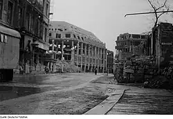 - Die Trümmer des Residenz-Kaufhauses wurden im Rahmen der Großflächenenttrümmerung 1950 beräumt,[6] anschließend blieb das Areal eine Grünfläche bis zum Beginn des Kaufhausneubaus des Karstadt-Kaufhauses Anfang der 1990er Jahre. Ein in den Planungen der 1960er Jahre hier vorgesehenes „Haus des Lehrers“, was das Grundstück zumindest tangiert hätte, kam über eine Grundsteinlegung Anfang der 1970er Jahre nicht hinaus, dieser wurde dann wieder verschüttet und 1988 stillschweigend entfernt.